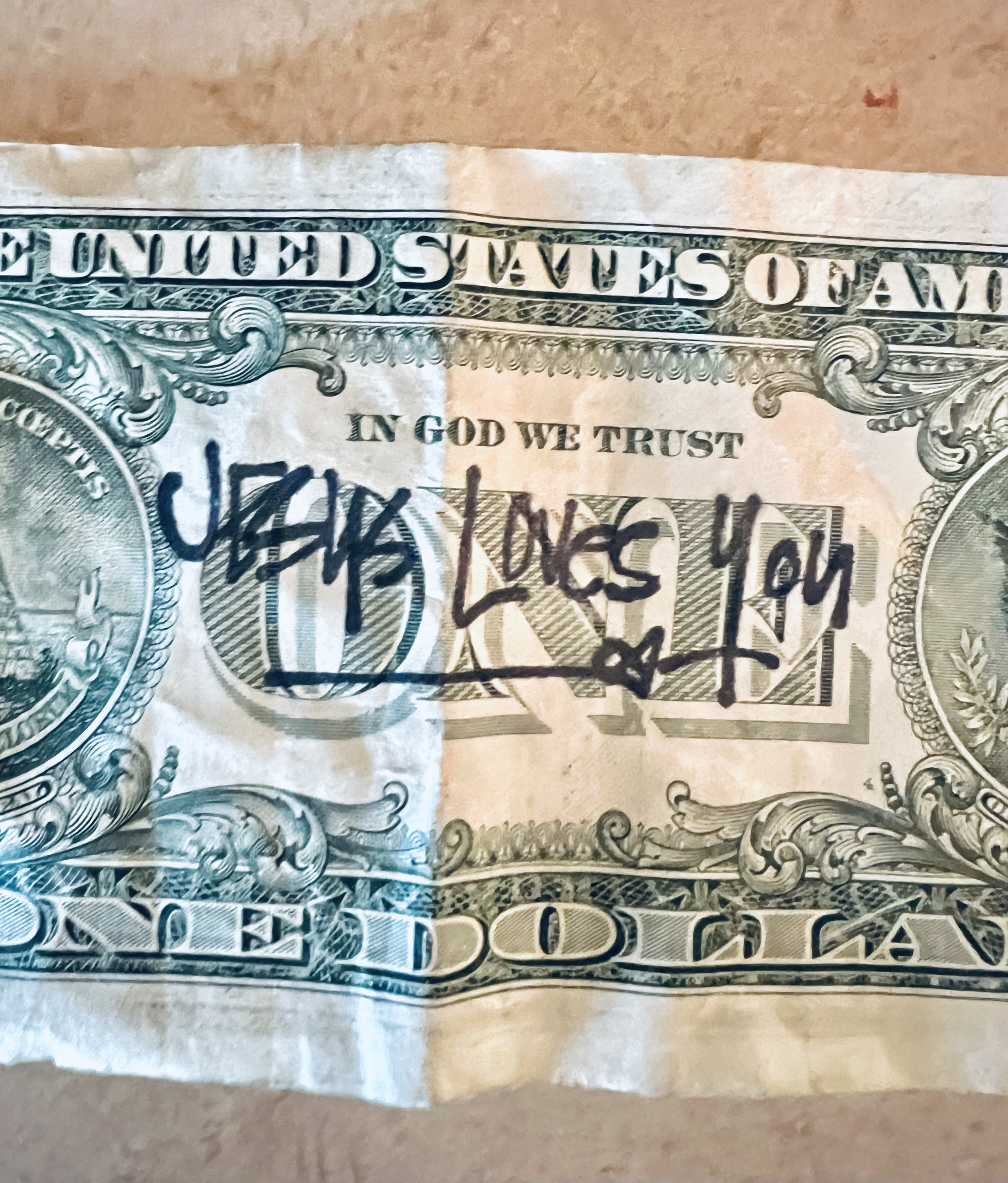 “So yesterday we had gotten our change back from one of the cashiers and as we looked through the money and one of the dollar bills had Jesus loves you written on it..Amen..and I thought that is so wonderful..just a simple gesture to spread the gospel..to bring hope to someone out there..as they look and read that they are saying that Jesus loves me..Amen..because we all seem to think from time to time that we have nothing to offer to someone else..that we are not really equipped or able..or the simple thing that we could offer another wouldn’t mean that much..but I tell ya guys we all would truly be surprised at how much the small things mean to others..those simple gestures means so much to others..its not gotta always be big or glamours..it sometimes is the small yet meaningful thing that we do for others in a moment that last a lifetime to them and their hearts..Amen..so today just know that each of us have great ways of spreading the gospel and sharing it with others..Amen..a kind word..a listening ear..a nice phone call..a facetime..a message..a card sent in the mail..Amen..because God always seems to give us an idea or a task to do..and in ourselves we think that’s silly..or I don’t wanna do that..and we let it pass by without listening..but we never know what someone else is going through in their lives..Amen!”