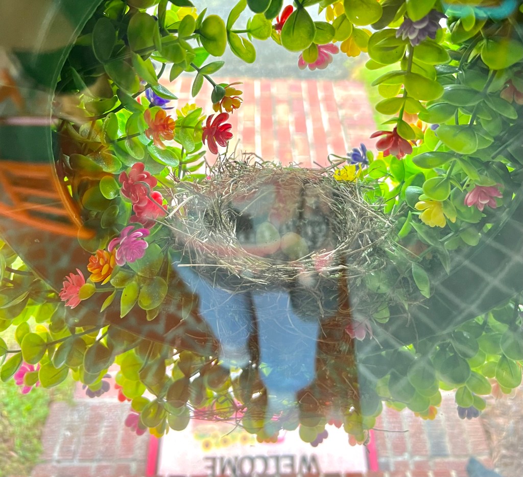 “So this morning I went out to the sunroom to open the windows and turn the ceiling fan on..because I love to let the fresh air in the house..but as I did I am assuming that yesterday evening a momma bird decided to build a nest in our wreath hanging on the door there..and there are two little tiny eggs in it..so of course we won’t be using that door until her babies are born..Amen..but as soon as I seen this I began to think about Jesus and at how He said in the book of Matthew that foxes have holes and birds have nests..but the Son of Man has no place to lay His head..Amen..and Jesus was speaking to one of the teachers of the law..for he had said to Jesus I will follow you wherever you go..and that was the Lords response to him..Matthew 8:19-20..Amen..in otherwards following the Lord is a cost to be paid..and some say that it will make you homeless..generally speaking here..that following the Lord we all say we do..but when it comes to the cost of following Him I know all to well..that we second guess His decisions..we second guess if He really said what He said to us..and we make excuses..Amen..because we are not at all homeless not truly when it comes to the Lord..we all still do what we wanna do..when we wanna do it..Amen..and again just as our Lord..He denied it all..He was truly about His Fathers business..through the pain..through the suffering..through the heartaches..the denial and betrayal..of His dearest and most closest friends..Amen!”