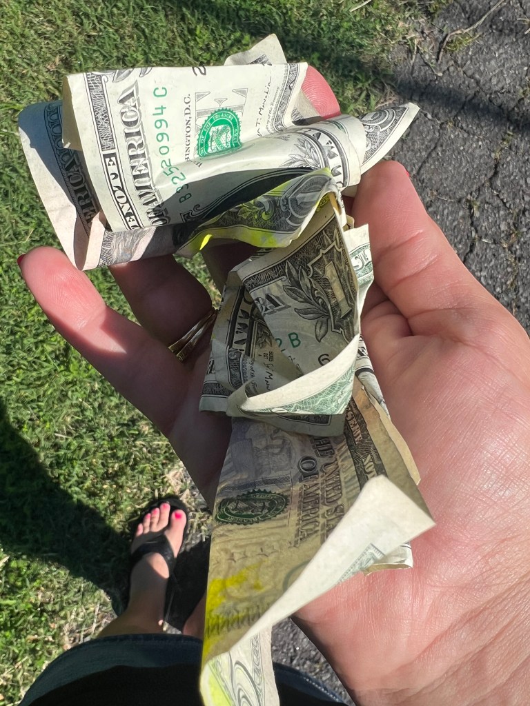 ”So it’s been almost a month ago but Anthony & I were getting ready to go home to West Virginia for Kristi’s surgery..and I walk down to the end of my driveway to check our mail before we left and as I am walking I keep thinking well I need to go by a ATM machine to get money for the tolls..but as am almost to the end of my driveway I see all of this stuff laying in the yard so I assume it’s trash..but needless to say it was money..and I begin picking it up..mind you I’ve found quarters and many pennies but never cash money..so it was spread out from one side of my driveway to the other..Amen!”