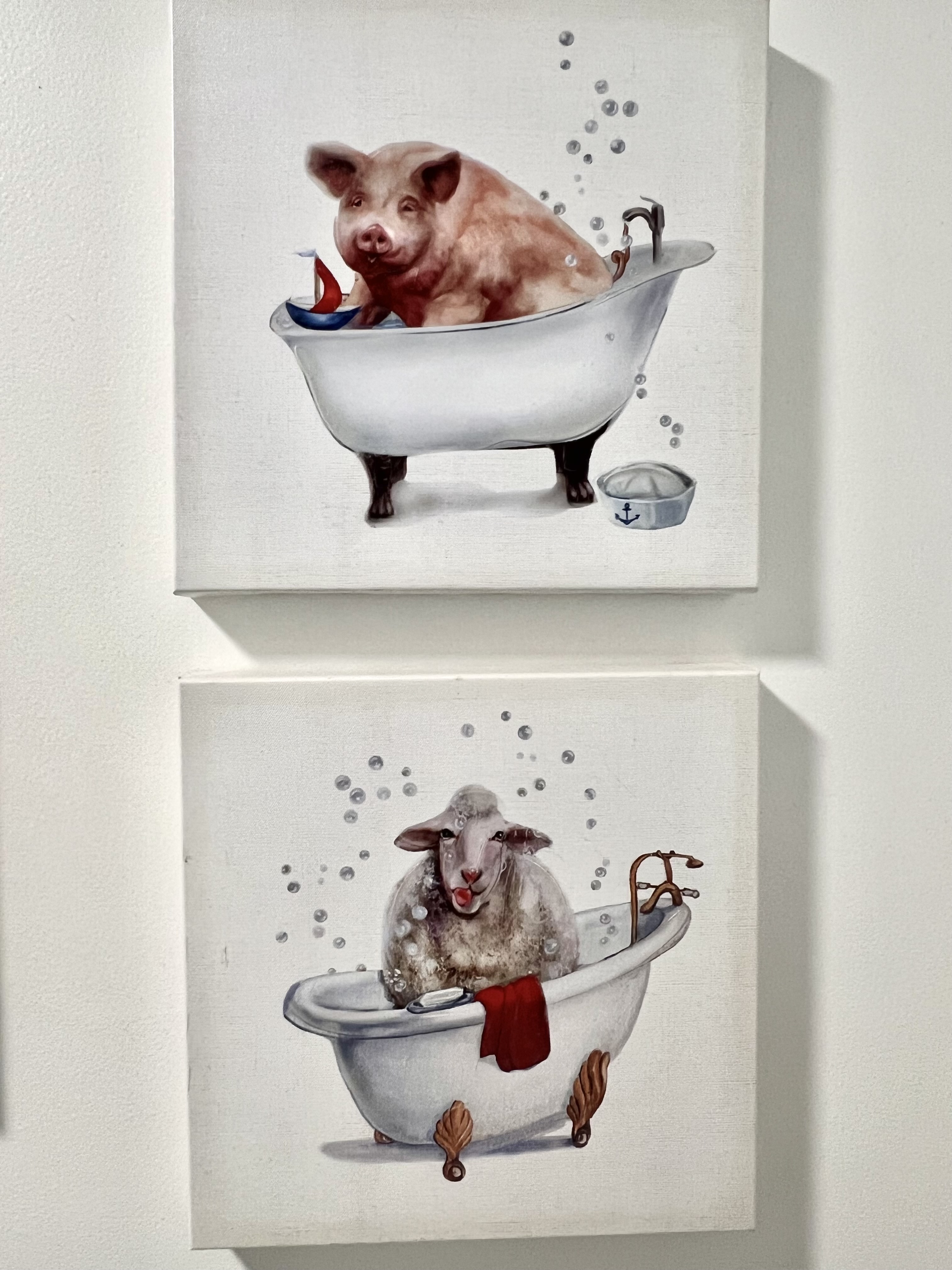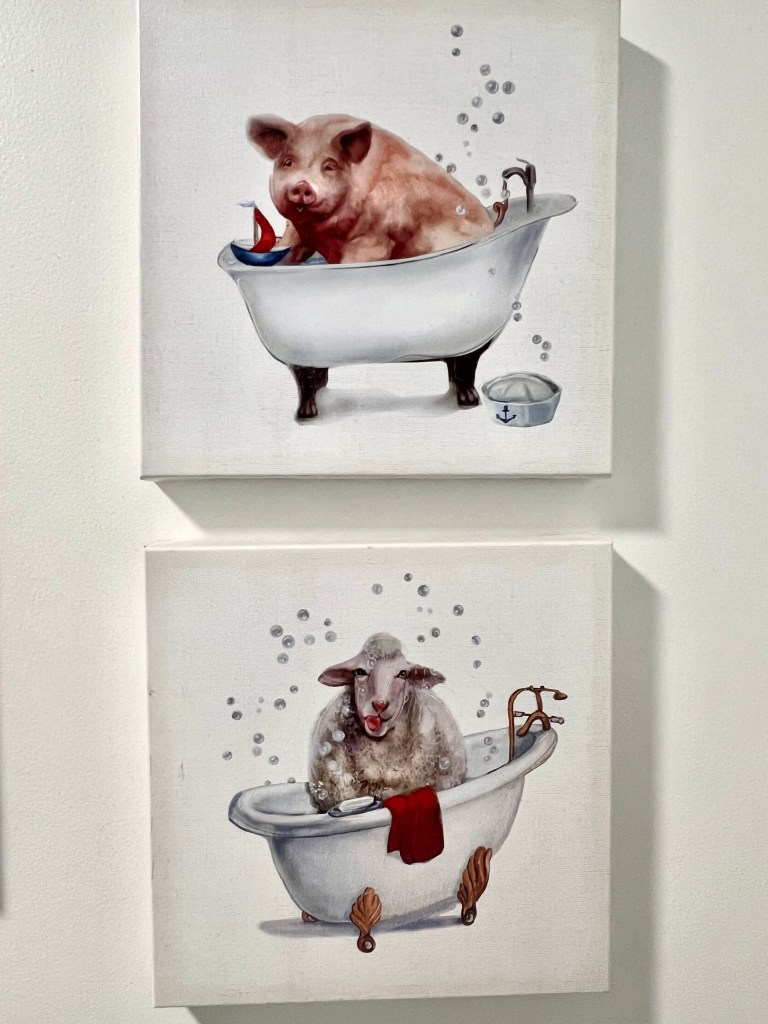 “So these two pictures hang in my bathroom..and this morning I am looking at them and I begin to think to myself how wonderful and righteous the Lord is to us..Amen..and I begin to think that even the pigs and the sheep they all get to be bathed in Gods love..Amen..that He accepts us all..the dirty..the clean..the in between..all of us He accepts to come and to be bathed in His love..in His mercy..and in His grace..Amen!”