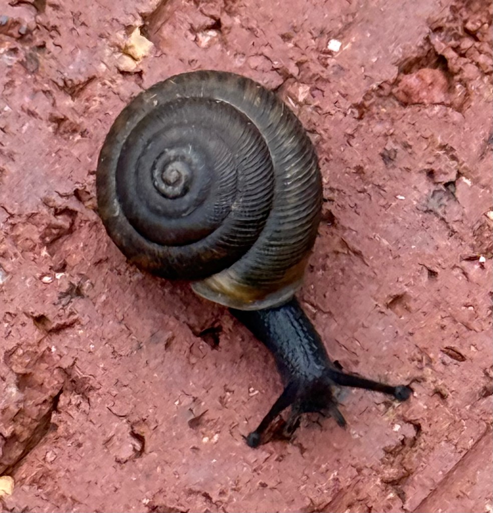 “This morning, as I was heading out to the field to feed the birds, I came back toward the sidewalk and spotted the tiniest little snail—just as cute as ever—slowly making its way. I went back inside to grab my phone so I could zoom in and take a picture and video. About an hour later, I went out with my dog Benjamin, and that little snail still hadn’t made it far—but he was moving along at his own pace. Amen.