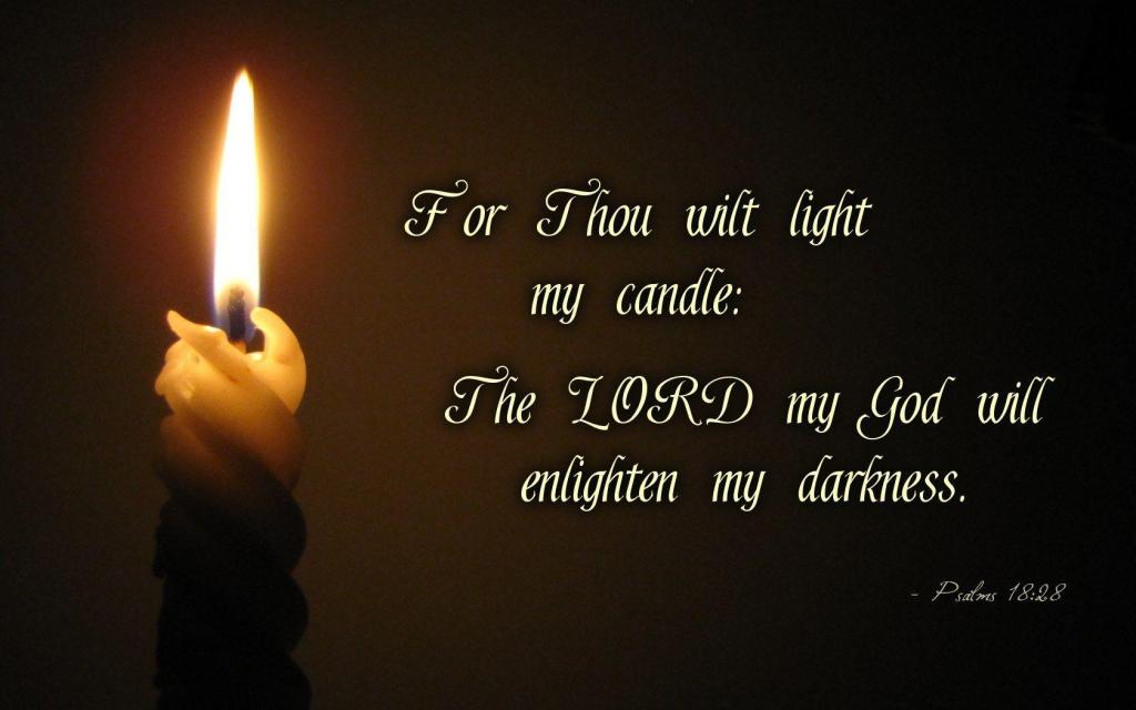 I love the Scripture that says, “For You will light my candle; the Lord my God will enlighten my darkness.” Psalm 18:28. Amen. Darkness comes quickly at times. The darkness of this world tries to come and take us out. Amen. But it is a wonderful thing to know that we are the apple of God’s eye that we can call on Him anytime, day or night, and He will be there, never leaving us in our hardships or trials. I praise the Lord that He is our shield and our buckler, protecting us from the schemes of the enemy.